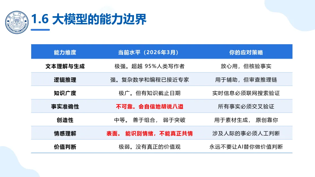 讲座开篇梳理人工智能发展脉络,从 1950 年图灵测试、1956 年达特茅斯会议标志 AI 诞生,到历经六阶段发展,迈入深度学习与大模型爆发期。同时明确 AI 通向 AGI 的五级进阶与能力四层金字塔,指出 OpenClaw 处于行动层突破阶段,是连接大模型决策与实际执行的关键基础设施。结合 2026 年大模型能力边界,提示文本生成、逻辑推理能力突出,但事实准确性、价值判断存在短板,需合理使用。