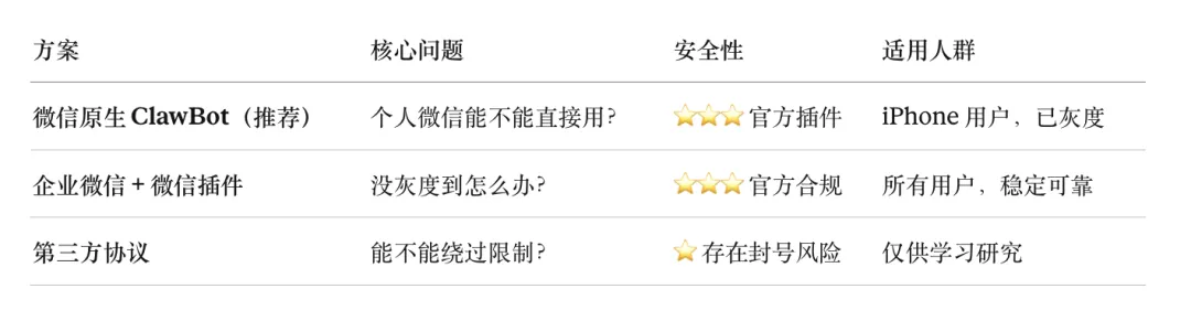 你可以把这三种方案想象成进一栋楼的三种方式——原生 ClawBot 是正门钥匙,企业微信是物业开的侧门,第三方协议是翻窗户。能走正门,就别翻窗。