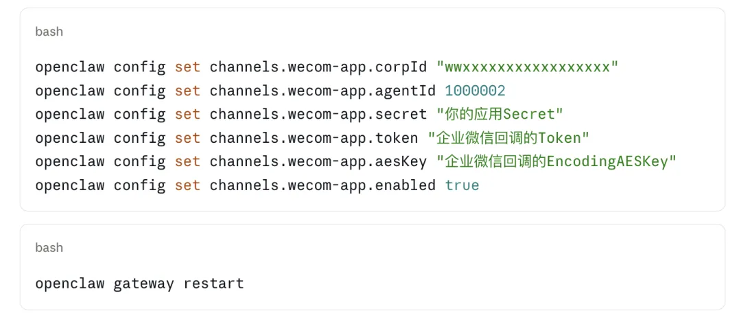 ❌ 先在企业微信后台填 URL → 验证失败✅ 先在 OpenClaw 配好通道并重启 → 再去企业微信填 URL