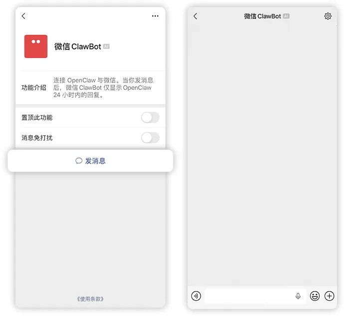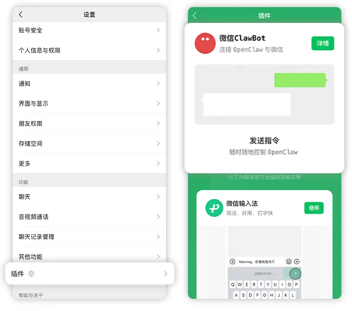 绑定 OpenClaw : 按插件里的指引,在 OpenClaw 中添加微信插件,运行龙虾的设备上执行安装命令再扫码,操作完就能在微信聊天界面直接喊龙虾 AI 干活,主打一个丝滑衔接。