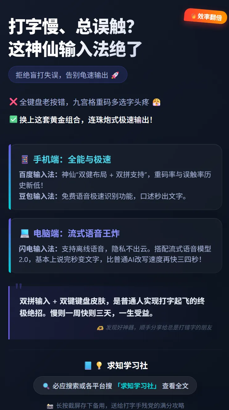 输入效率提升,根本是找到适合自己场景的工具——语音用豆包,打字用双拼,电脑端要免费有隐私就选闪电输入法。工具选对了,打字这件事才能从"负担"变成"顺手"。
