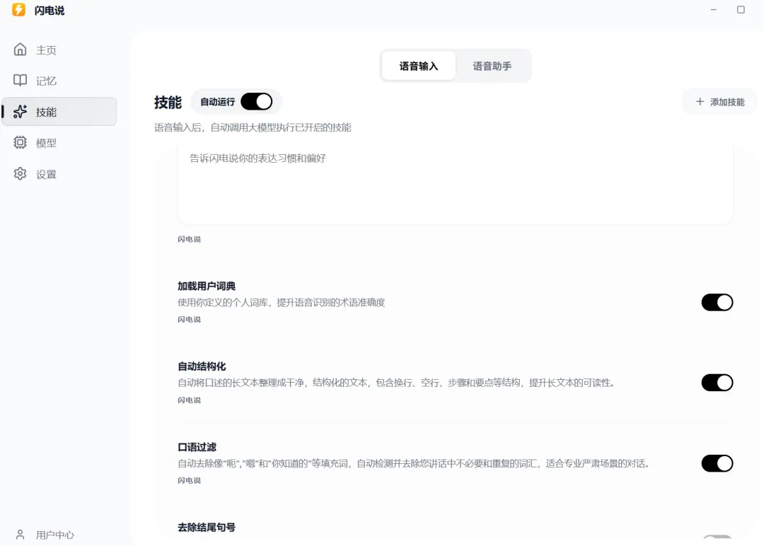 使用 AI 模型后可开启自动结构化 ,将口述的长文本自动转换为包含步骤、要点等结构的干净文本,提升可读性;支持口语过滤 ,基于自然语言处理(NLP)技术,自动去除"嗯""啊"等填充词和重复词汇,并可设置个性化偏好,让输出符合你的表达习惯;此外也支持记忆功能 ,可设置个人词库,辅助 AI 精准识别自定义术语。