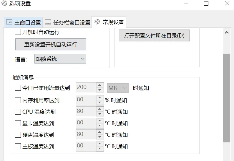 当然, 如果你觉得放桌面放任务栏,都觉得挨说,你可以都不显示。然后把通知打开,比如当CPU温度达到多少°,流量使用达到多少时,就发送通知提醒你。