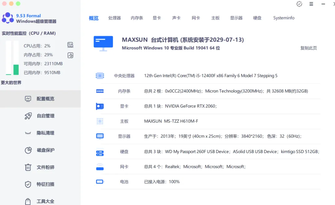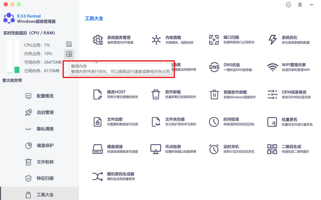 我最近在用一个叫Windows超级管理器的工具,同为绿色免安装软件,单文件版,打开主界面能直接看到CPU、内存占用,还有电脑的硬件参数。功能方面真的很全面。