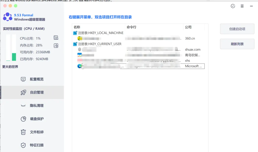自启管理,显示的是电脑的启动项,你还可以自己“创建启动项”
