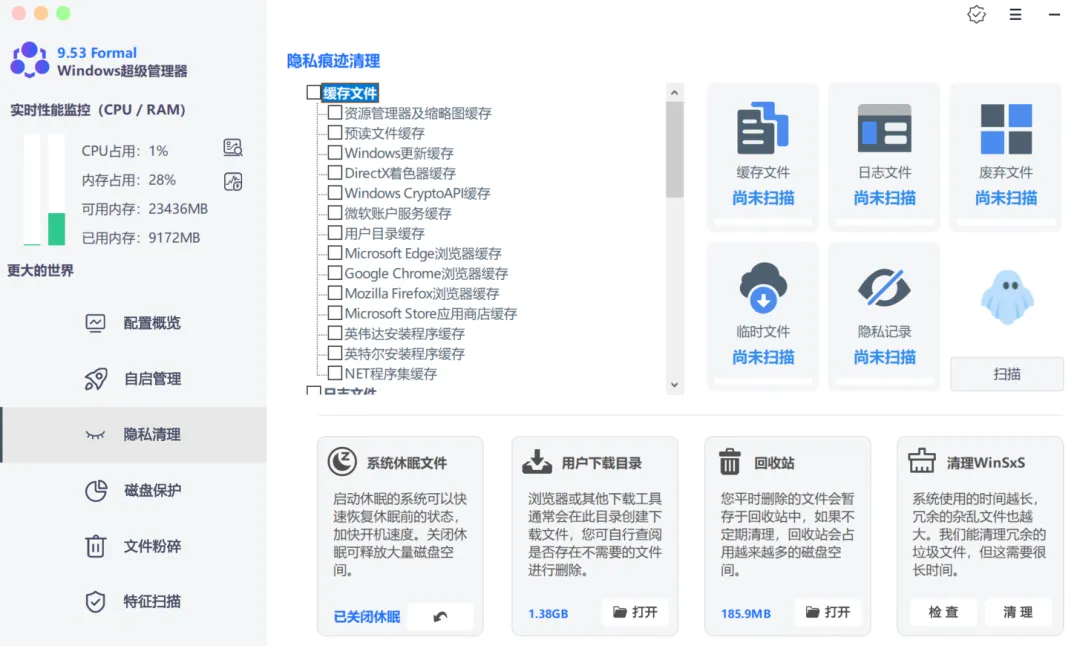 隐私管理,可以清理电脑里的各种缓存,勾选后,点击右侧边的扫描。