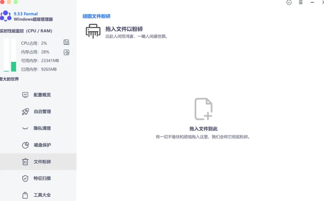 文件粉碎的功能,是把你电脑里顽固的、删除不了的文件彻底粉碎删除,拖入软件中即可立即粉碎。