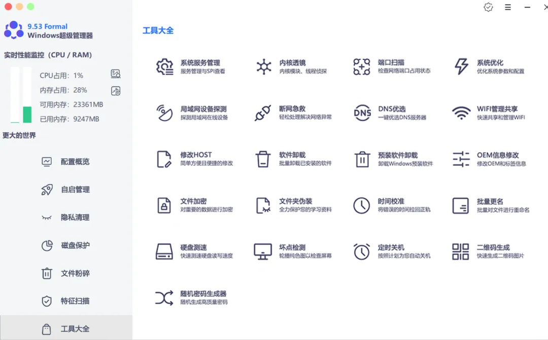 工具大全简直是个百宝箱,里面整合了超级多点开就能用的小工具,像修改HOST、二维码生成、断网急救、时间校准等等,你平时能想到的维护需求它基本全包了,这些小工具不用你去到处瞎找,点一下就能直接用,真的巨方便,