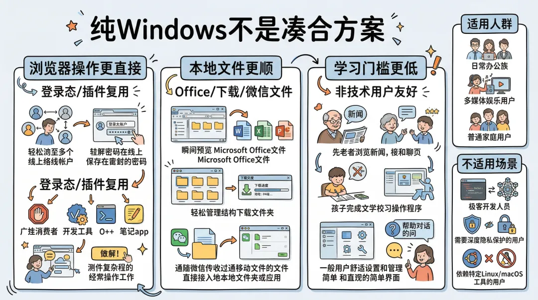 不是“凑合方案”。在真实办公场景里,纯 Windows 常见优势是: