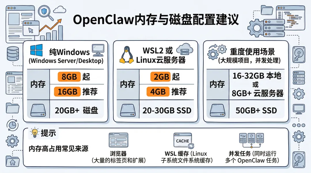 先说原理:你看到内存高,不一定是 OpenClaw 本体,常见来源是浏览器、WSL2 缓存、并发任务。