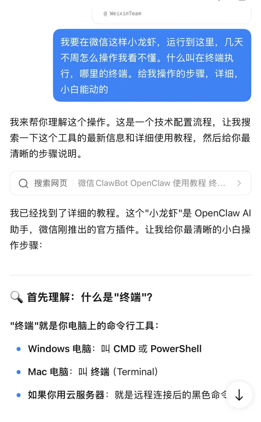 但我看到第一段话就不知道怎么做了,查了AI说是要在"终端执行"。啥是终端,开启一步步请教的进程。