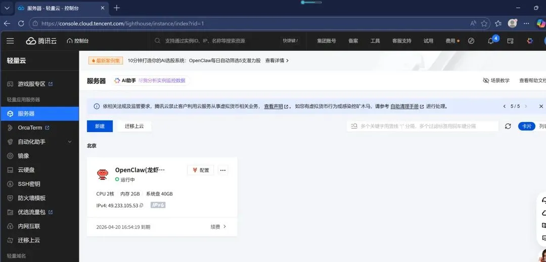 本地安装特别麻烦:要配Node.js、Git,还要解决网络问题,一步一报错。后来换到腾讯云轻量服务器,发现镜像里已经预装了OpenClaw,省了大量时间。