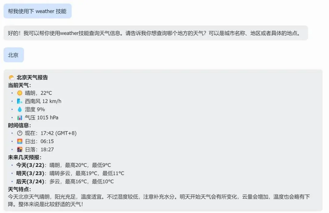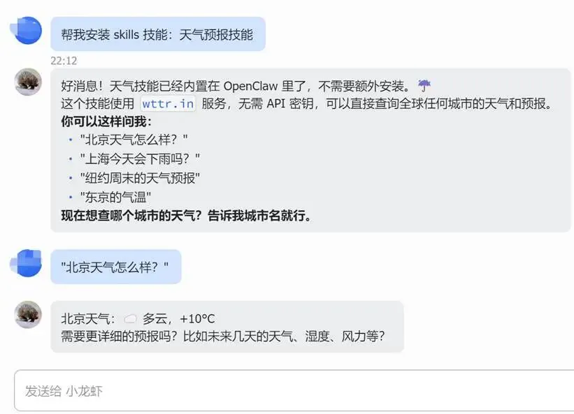 “帮我安装 skills 技能:天气预报技能。”
