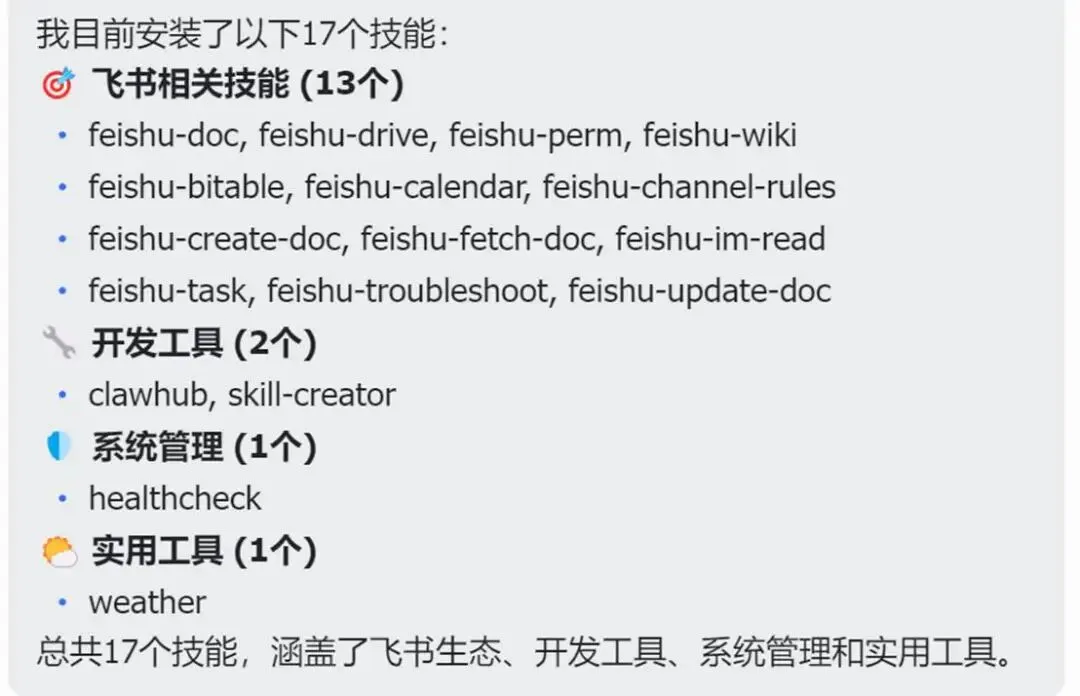 安装后,建议检查该技能的权限等级。OpenClaw 将技能分为三类: