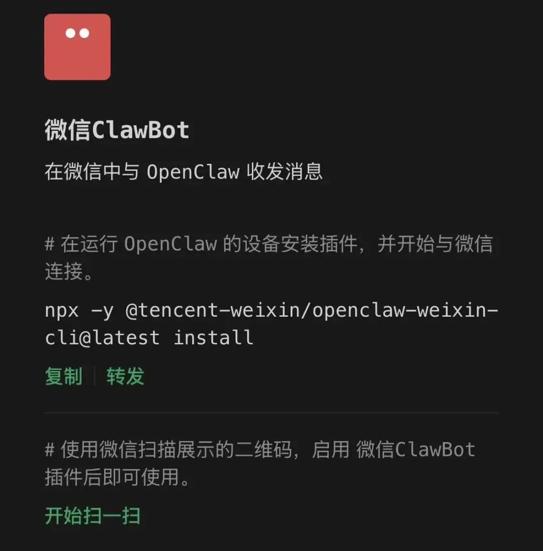 npx -y @tencent-weixin/openclaw-weixin-cli@latest instal出现了微信二维码,扫码连接即可。然后你就收获了一只微信版的龙虾。