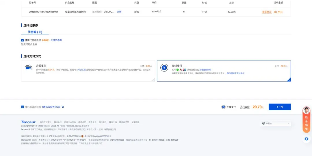 选择服务器配置:新手推荐入门基础款,月租9.9元,完全满足OpenClaw基础运行需求,后续可根据使用需求升级;