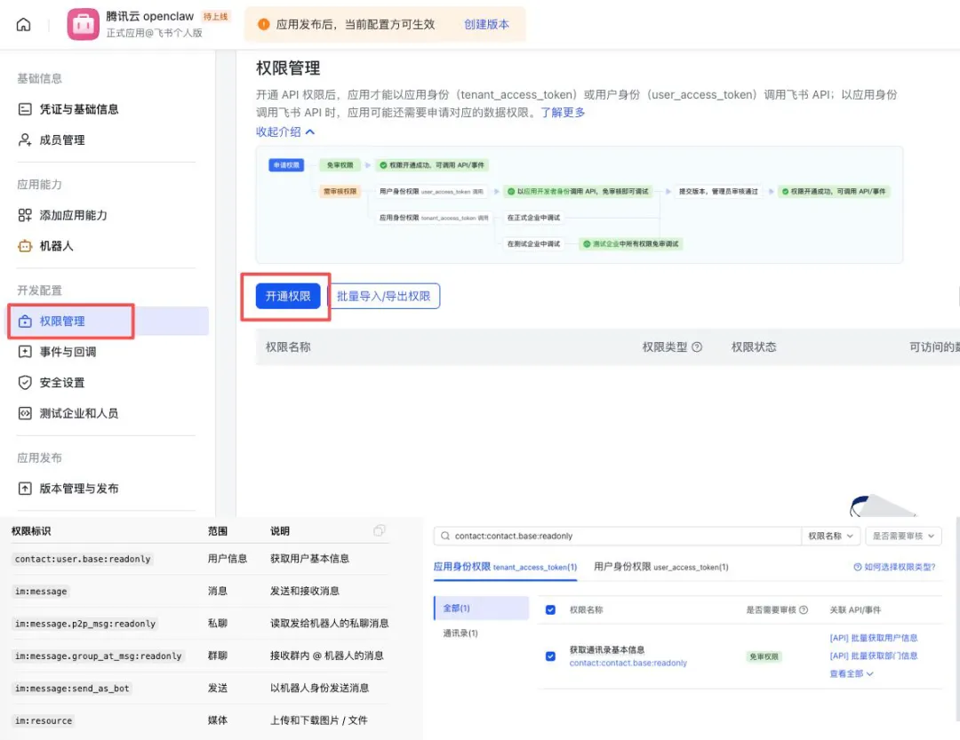 添加应用身份订阅:将机器人绑定到自己的飞书账号,实现个人专属指挥;
