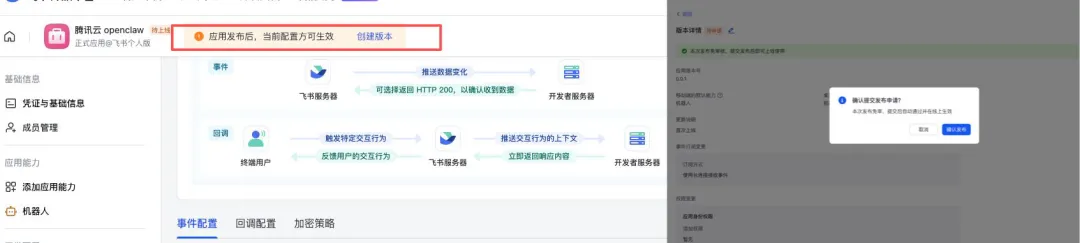 最后一步:点击版本管理与发布,创建新版本,点击申请发布,飞书后台审核通过后,飞书机器人就配置完成了,此时在飞书给机器人发消息,就能指挥OpenClaw工作。