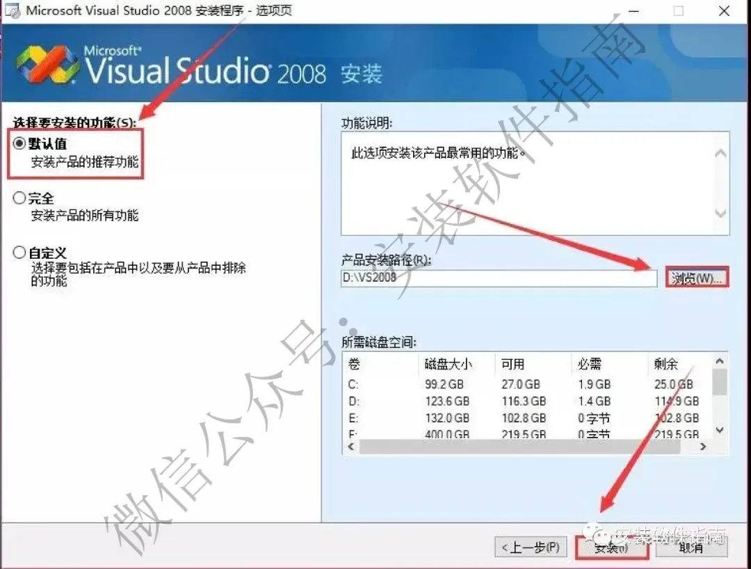 10.点【默认值】,点【浏览】选择软件安装路径(建议安装在D盘里新建一个VS2008的文件夹),最后点【安装】