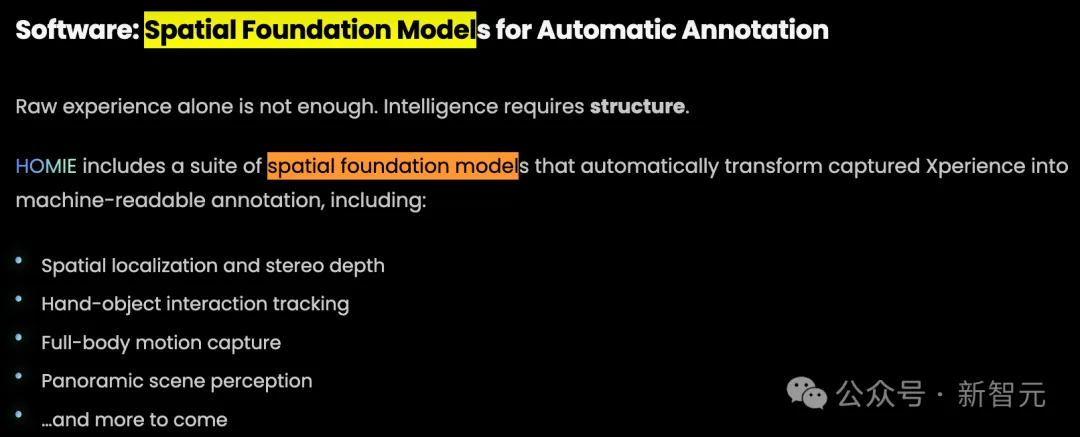 目前,这套系统已覆盖的关键能力包括:空间定位与深度恢复、手—物交互追踪、全身动作捕捉、物体与场景语义理解、任务描述与状态变化建模,以及更多持续扩展中的结构化维度。