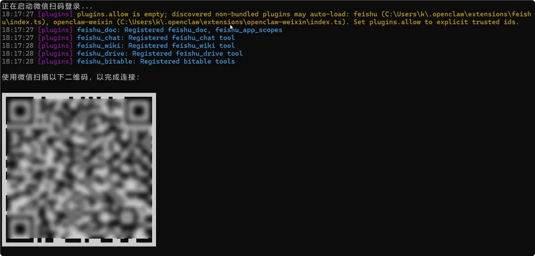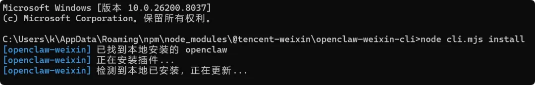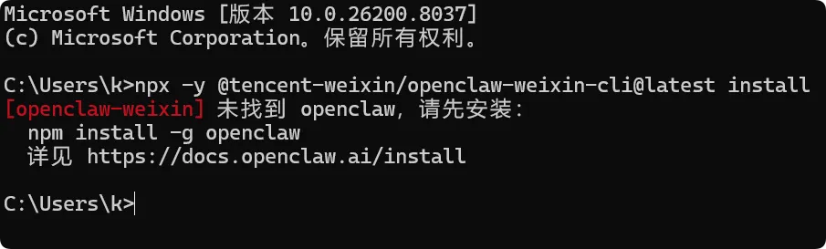 C:\Users\k\AppData\Roaming\npm\node_modules\@tencent-weixin\openclaw-weixin-cli修改拓展包的 cli.mjs 部分代码,跳过检测,这样绕过命令不兼容的问题,搜索 if (!which("openclaw")) { 这段内容,目前是在41行,然后注释掉