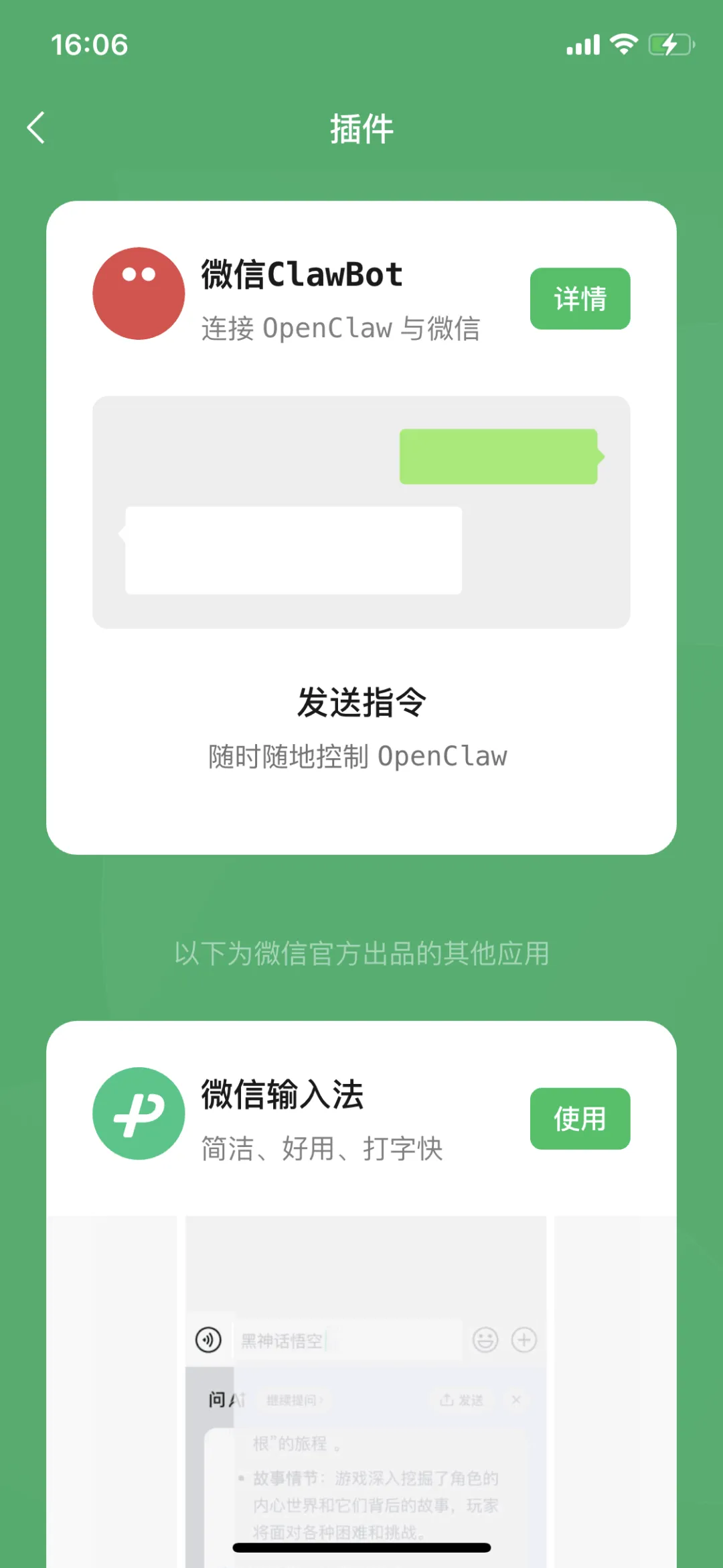 更新完毕点击插件,就可以看到微信clawbot,点详情。