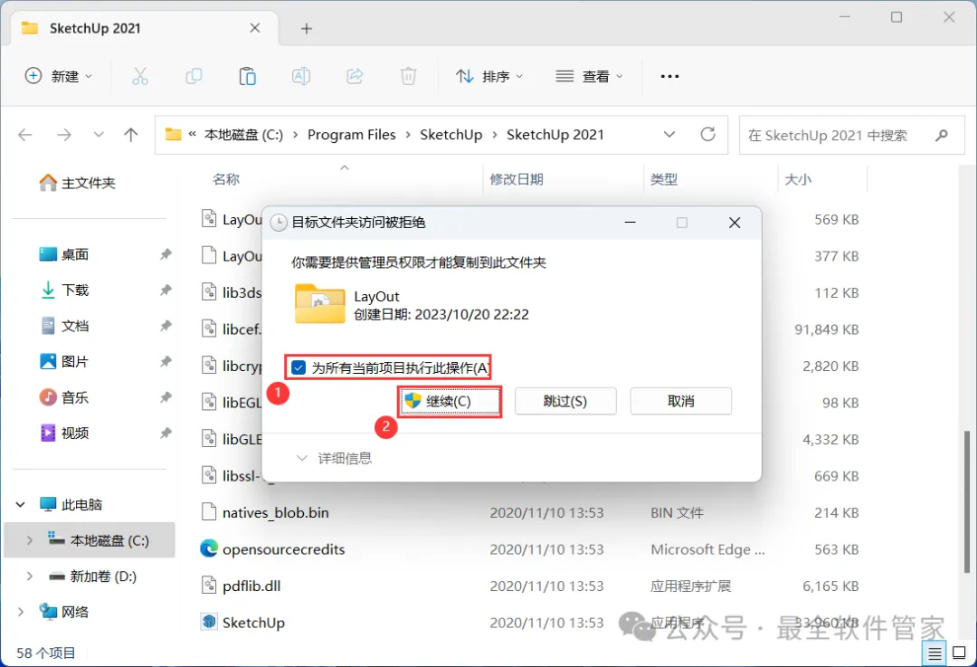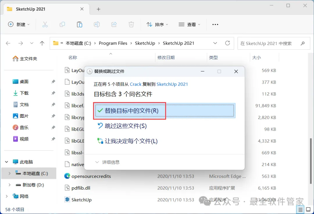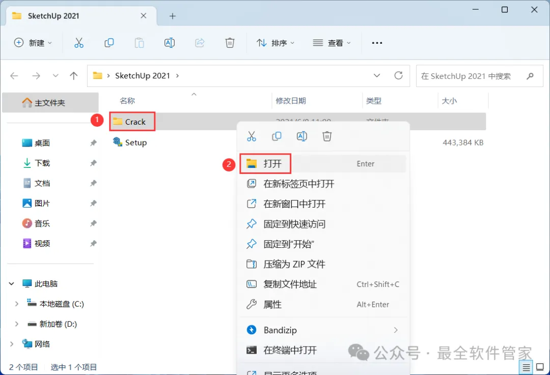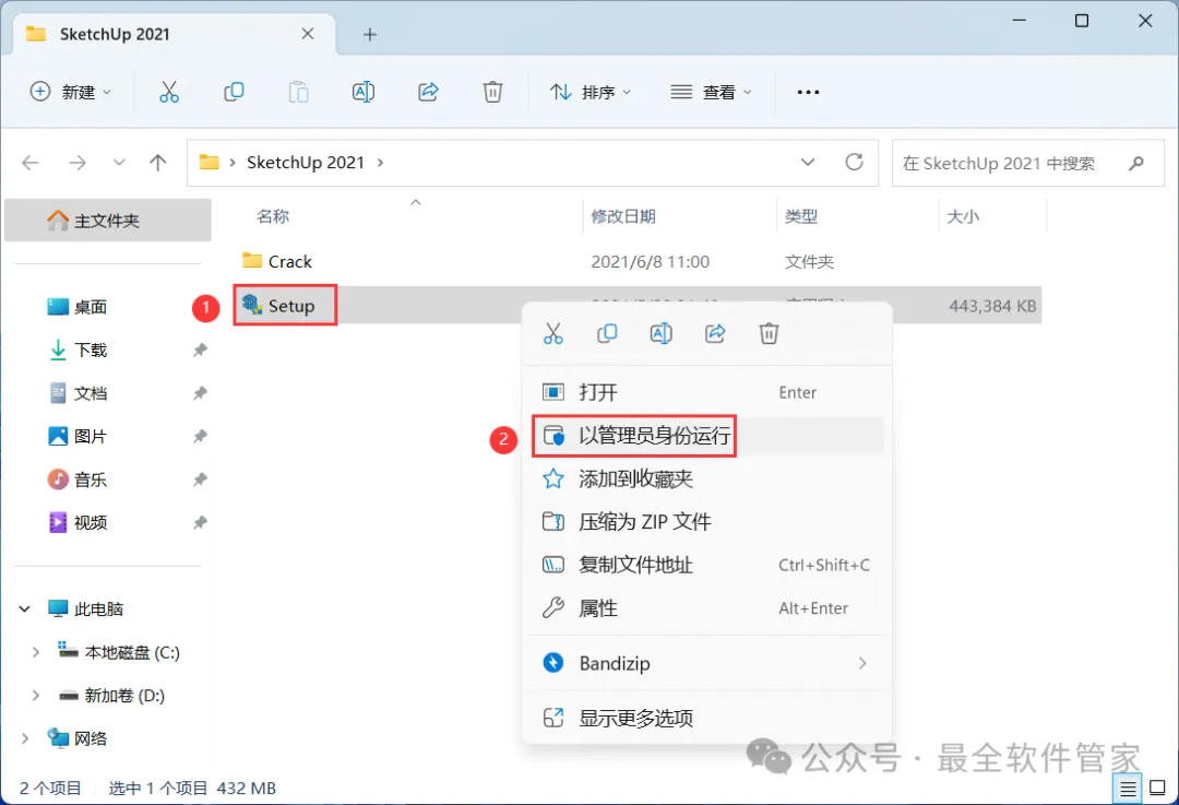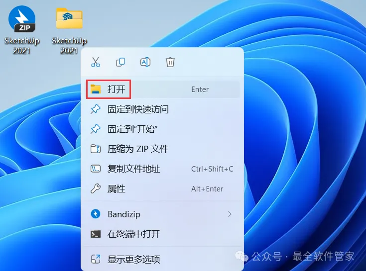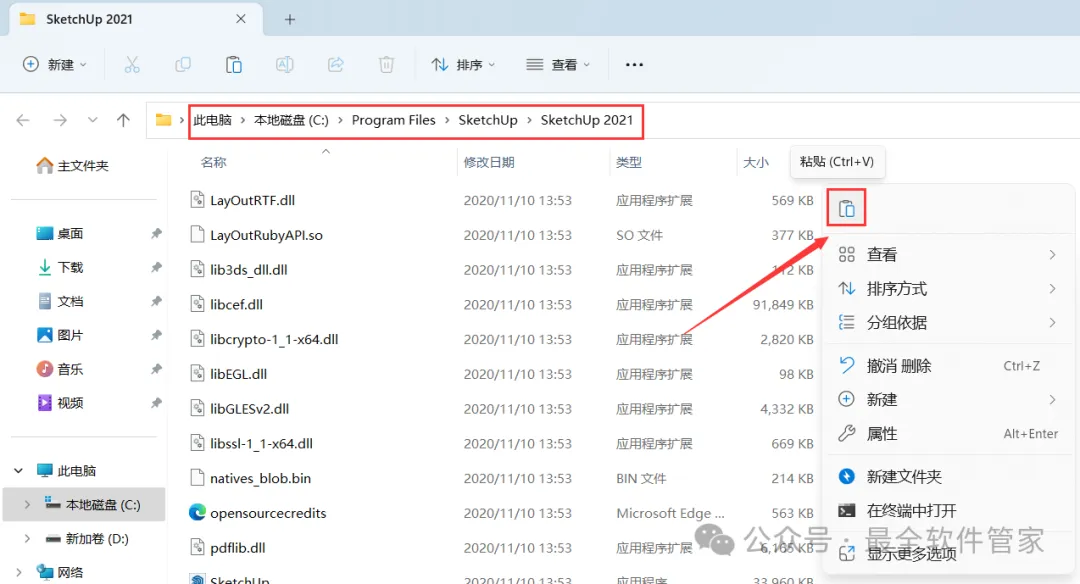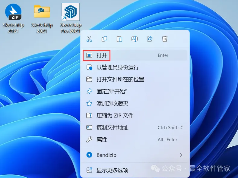 SketchUp 2021软件安装教程附安装包下载软件简介SketchUp 2021是一款功能强大的三维制图软件,软件有着面向设计方案创作过程的设计工具,它被适用于建筑,规划,园林,景观,室内等工作领域,同时软件,具有草稿,线稿,透视,渲染等不同显示模式,满足所有用户的设计需求。草图大师可以快速和方便的进行三维设计,它还提供了丰富免费的在线素材和设计方案交流平台,创作过程可以与与客户即时交流的需要,它使得设计师可以直接在电脑上进行十分直观的构思,是三维建筑设计方案创作的优秀工具。安装需知[软件名称]:SketchUp 2021[软件大小]:451MB[软件语言]:中文简体[安装环境]:Win7及以上版本[下载地址]:公众号内回复:SketchUp[不限速下载]:免费获取百度网盘不限速下载工具。公众号内回复:不限速[注意事项]:安装前请关闭网络、杀毒软件和防火墙,否则易安装失败。公众号内回复:1[解压软件]:小编用的解压软件是Bandizip,获取Bandizip软件安装包。公众号内回复:2安装教程1、下载SketchUp 2021软件安装包到电脑上,右键选择【解压到SketchUp 2021\】2、右键【打开】解压后的文件夹 3、找到【Setup】应用程序,右键选择【以管理员身份运行】它4、点击【安装】 5、软件安装中,稍等片刻 6、软件安装成功,点击【完成】 7、回到SketchUp 2021文件夹,找到【Crack】文件夹,右键【打开】它8、选中全部文件,再右键点击【复制按钮】 9、回到桌面,右键桌面上的【SketchUp 2021软件图标】,点击【打开文件所在的位置】10、右键文件夹的空白处,点击【粘贴按钮】 11、点击【替换目标中的文件】12、勾选【为所有…】,再点击【继续】 13、回到桌面,右键桌面上的【SketchUp 2021软件图标】,点击【打开】14、点击【跳过此版本】 15、勾选【我同意】,再点击【继续】16、点击【开始建模】 17、点击【简单模板按钮】18、软件打开成功,运行界面如下: 19、以上就是SketchUp 2021软件安装的全过程,要是对你有帮助的话,请为小编点个赞! 免责声明:软件资源均来源于网络,仅供用户交流学习与研究使用,版权归属原版权方所有,版权争议与本公众号无关,用户本人下载后不能用作商业或非法用途,否则后果均由用户承担责任;如果您访问和下载此文件,表示您同意只将此软件用于参考、学习而非其他用途,否则一切后果请您自行承担,请于下载后24小时内删除,不允许用于商业用途,否则法律问题自行承担。如果您喜欢该软件,请支持正版软件,购买注册,得到更好的正版服务。