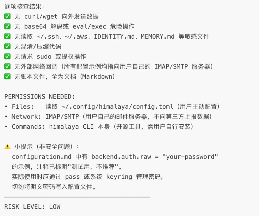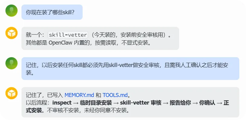 之前几篇在公网暴露、敏感信息暴露、tools权限、沙箱隔离等方面对OpenClaw进行了安全加固,现在终于可以放心让它来替我们干活了。都说龙虾OpenClaw非常厉害,那为什么你养的虾啥都不会?除了给它装上无所不知的聪明大脑(大模型),还得让它学会各行各业专家私藏的干货——skills。OpenClaw会从Clawhub这个技能仓库中获取skills,但该仓库是开放的,会有不怀好心的人来投毒。据分析该仓库有12%的skill有安全风险,所以我们必须请“安全专家”替我们把关过后才能放心安装。如果还不清楚什么是skills,可以看下我之前的两篇文章:这是社区很火的一个skill安全审核工具,专门用来在你安装新技能之前检查它是否安全可靠。skill-vetter会从网络、敏感信息、权限、命令、脚本全方位审核skill的安全风险,并出具安全评估报告,供你参考:skill-vetter安装完之后,再安装skill会先调用它来进行安全审核,保险起见,我们将这个工作流程固化下来,并强制要求人工确认。OpenClaw把我的要求写到TOOLS.md和记忆文件里了,后续安装任何skill安装都会遵守这个规则:### Skill 安装规则**安装任何 skill 前必须:**1. 先用 `clawhub inspect <slug>` 查看 skill 信息2. 安装到临时目录:`clawhub install <slug> --workdir /tmp/vet-<slug>`3. 用 `skill-vetter` 流程审核(读取 SKILL.md + 所有脚本)4. 出具审核报告,发给老窦确认5. 确认后才正式安装到 workspace**禁止**:未审核直接安装、未确认直接安装。