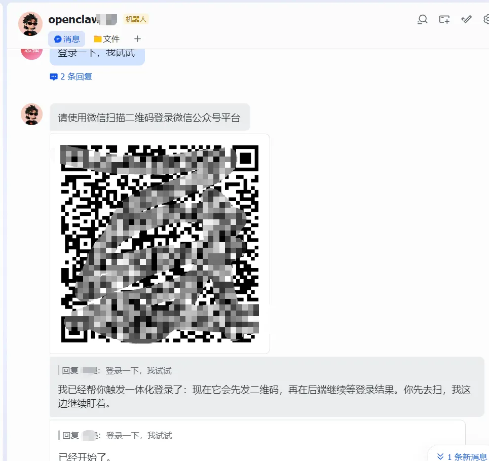 python scripts/wechat_article_assistant.py login-start \--channel feishu \--target user:YOUR_OPEN_ID \--account default \--waittrue\--json这条命令会:
