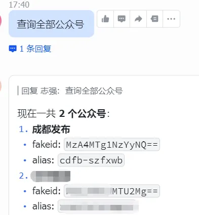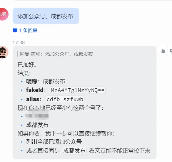 python scripts/wechat_article_assistant.py add-account-by-keyword "成都发布"--json查看当前公众号列表