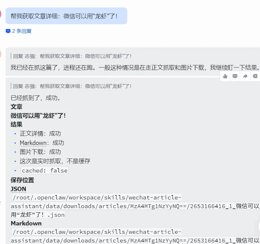 python scripts/wechat_article_assistant.py article-detail \--link"https://mp.weixin.qq.com/s/xxxxxxxx"\ --download-images true\ --include-html false\--json执行后通常会得到:
