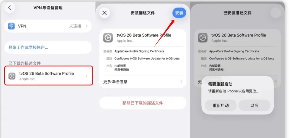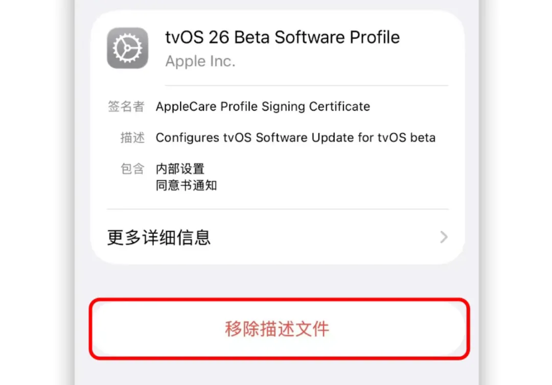 也可以走设置—通用—VPN 与设备管理,在里面找到刚下好的那个,名称是 tvOS 26 Beta。