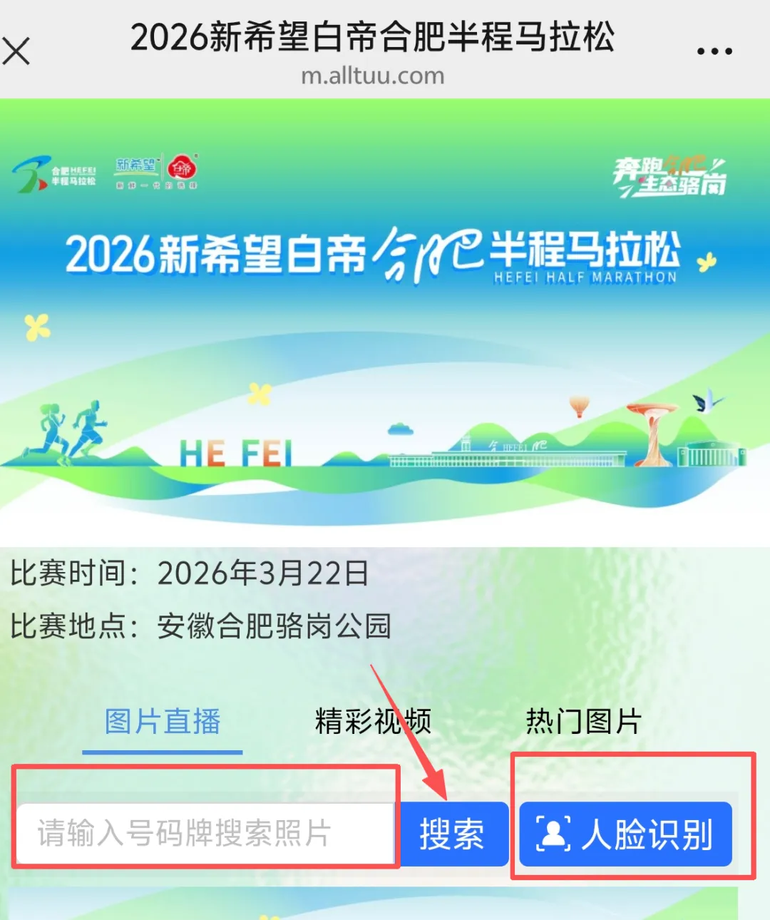 进入相册,在搜索框中输入你的“参赛号”或上传照片进行“人脸识别”,点击搜索,选中需要的照片进行下载。