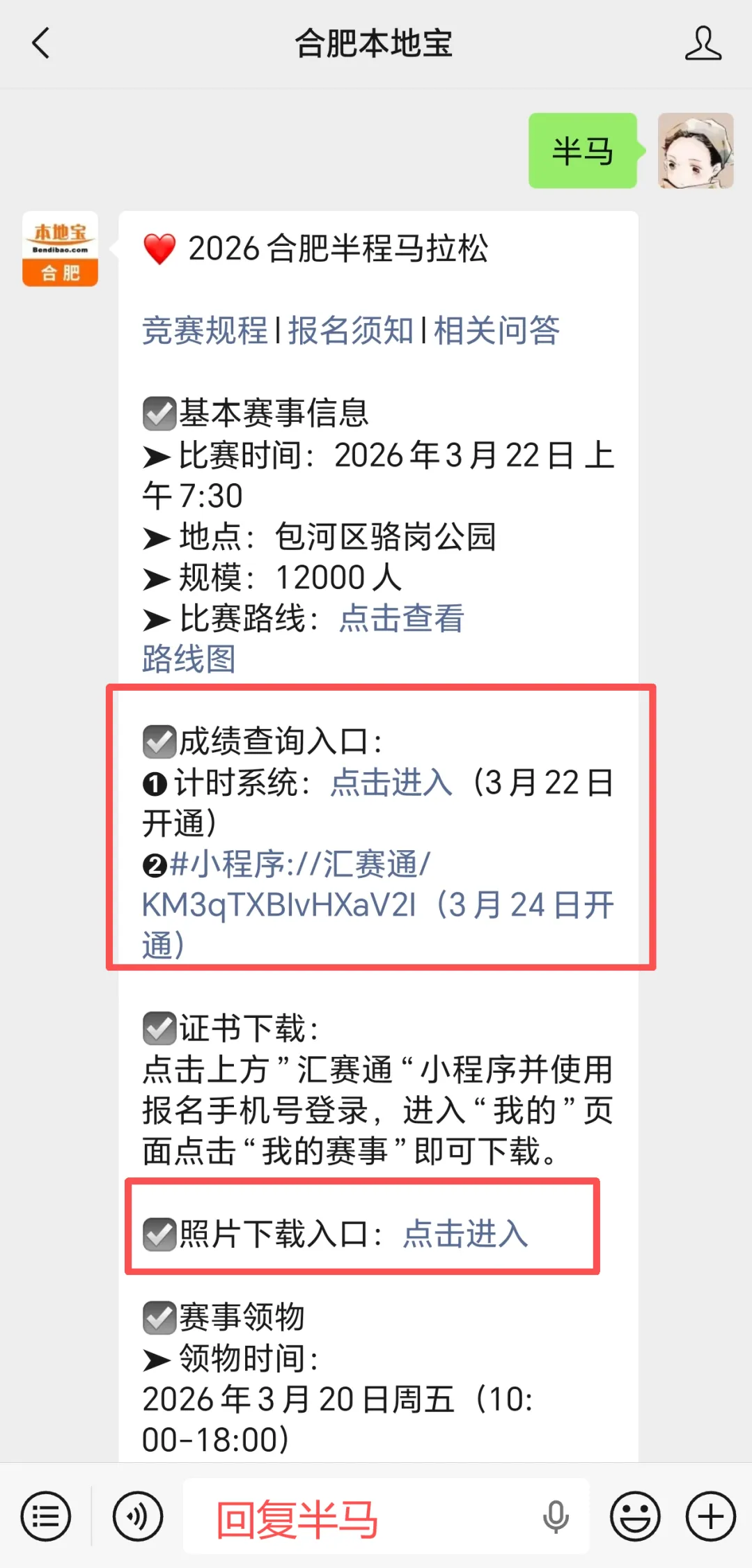 可以扫描下方二维码,关注【合肥本地宝】在聊天对话框回复【半马】直达成绩查询/照片下载入口。