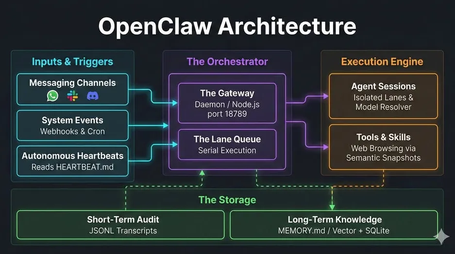 OpenClaw不仅仅是一个AI聊天机器人包装器,它更像是一个为AI智能体构建的操作系统。它解决了AI运行所需的基础设施问题,包括: