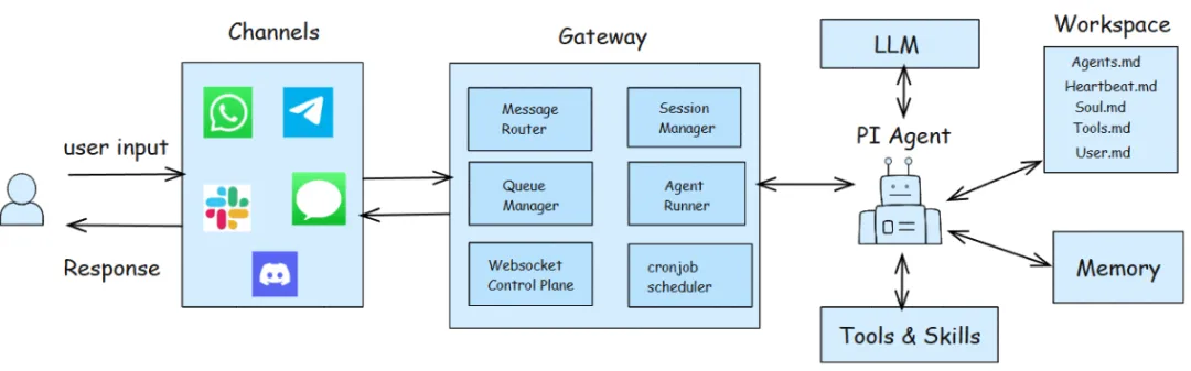 OpenClaw 的运行时建立在Pi Agent Core(由Mario Zechner开发)之上,。Pi是一个奉行极简主义的编码智能体,其核心能力高度浓缩为四个基础工具:Read(读)、Write(写)、Edit(改)、Bash(执行命令)。OpenClaw在此基础上扩展了更丰富的插件系统和多渠道支持。