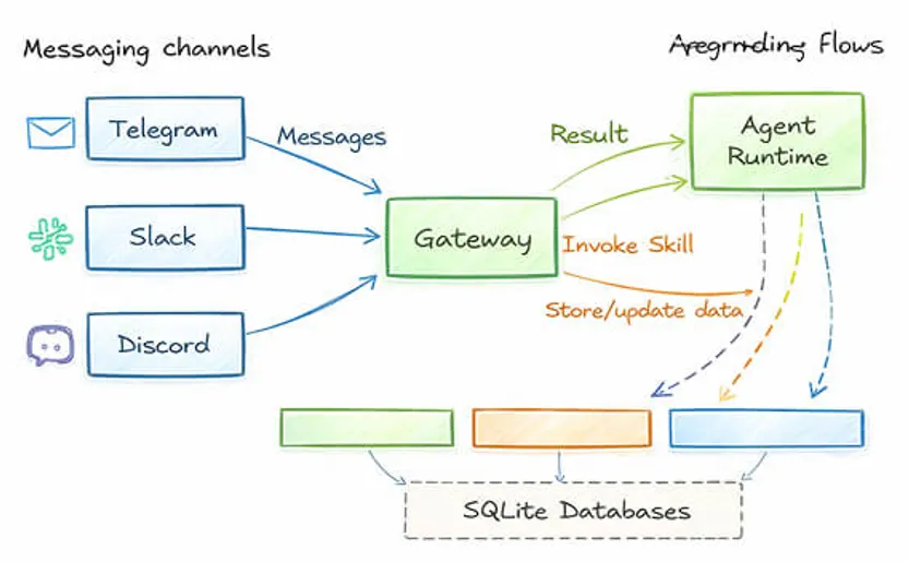Channel Adapters并非独立的外部服务,而是作为插件/适配器嵌入在 Gateway(网关)进程内部运行。当网关启动时,它会初始化所有配置的通道,它们之间通过进程内函数调用直接通信,从而消除了额外的网络开销。