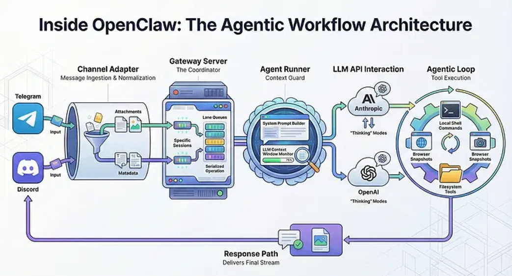 OpenClaw的处理流程是一个从接收输入到自主执行,再到结果反馈的闭环系统。它将大语言模型(LLM)作为无状态的推理引擎,并在其周围构建了一个复杂的执行环境,通常被称为 “智能体循环”(Agent Loop)。