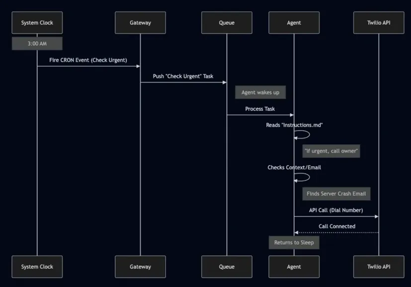 与被动响应的聊天机器人不同,OpenClaw具有自主触发(Autonomous Invocation)能力。