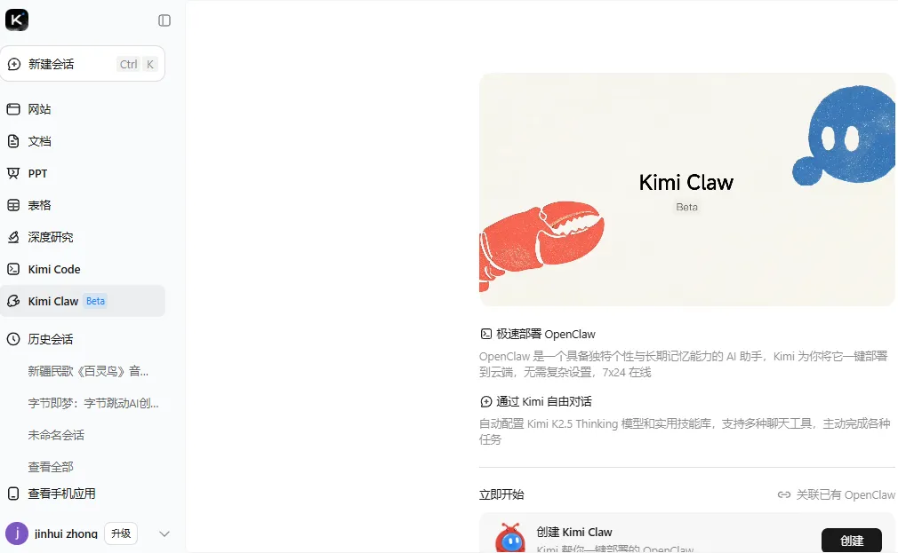 步骤: 登录Kimi官网,点击左侧 “Kimi Claw”。如果你是特定等级会员,点击“创建”即可在60秒内完成云端部署。
