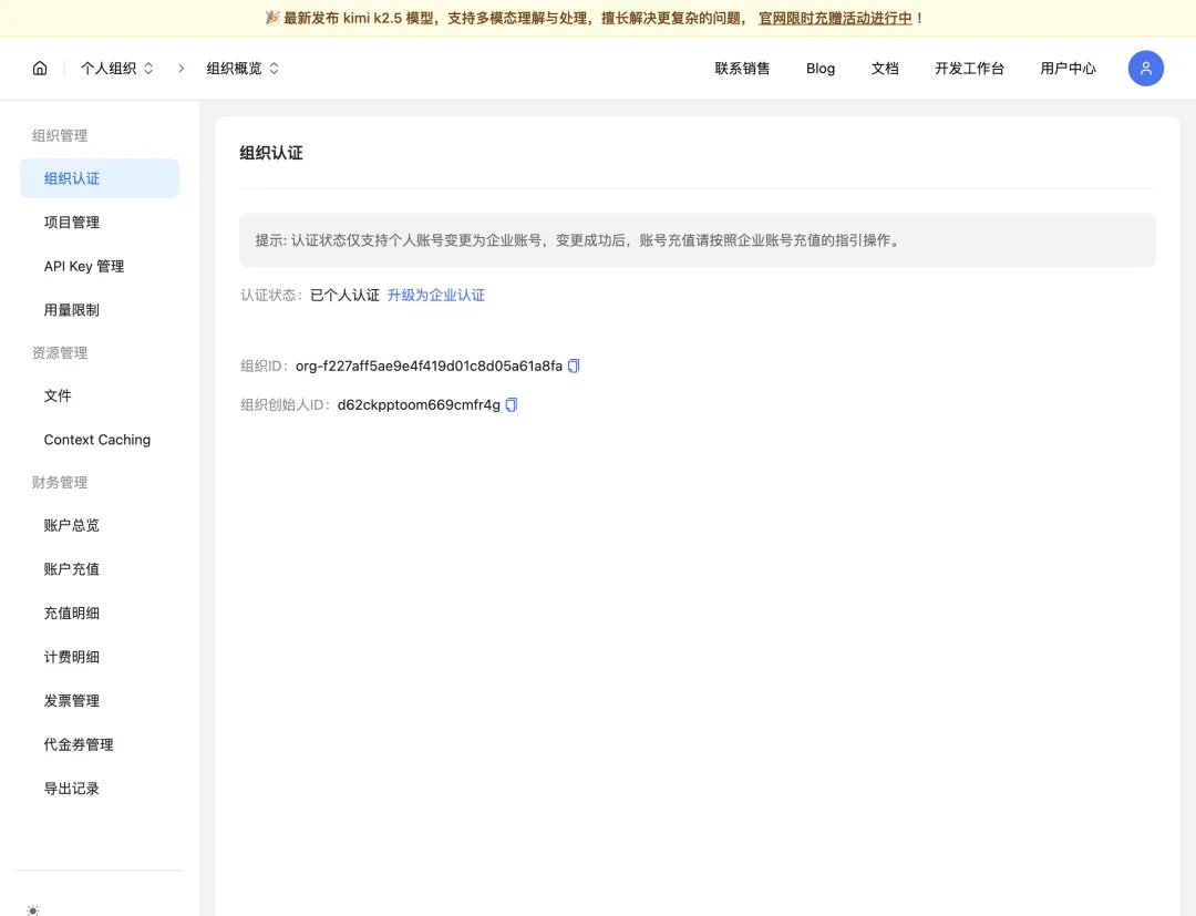 :Moonshot 需要个人认证才能领额度,不收费 - 网络要求