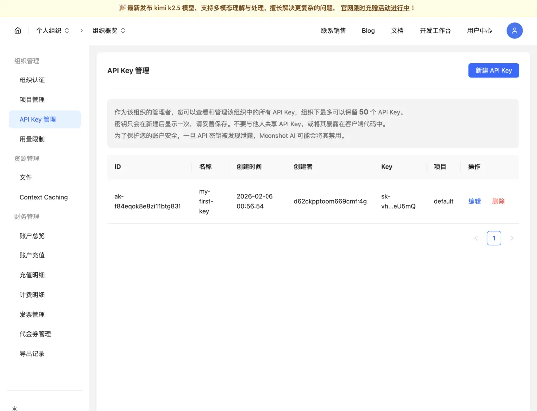 创建成功后,页面会显示你的完整 API Key。