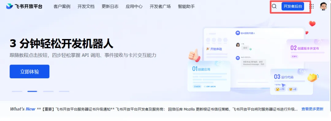 在浏览器中访问 open.feishu.cn,这是飞书的开发者平台。