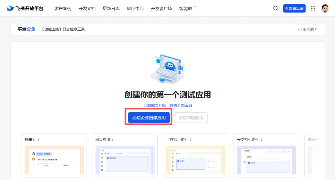 点击页面上方的「开发者后台」,然后点击「创建企业自建应用」。