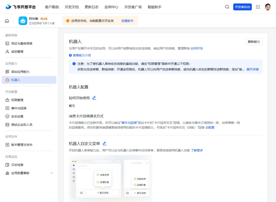 回到应用详情页,进行事件与回调配置,让机器人能接收群消息。