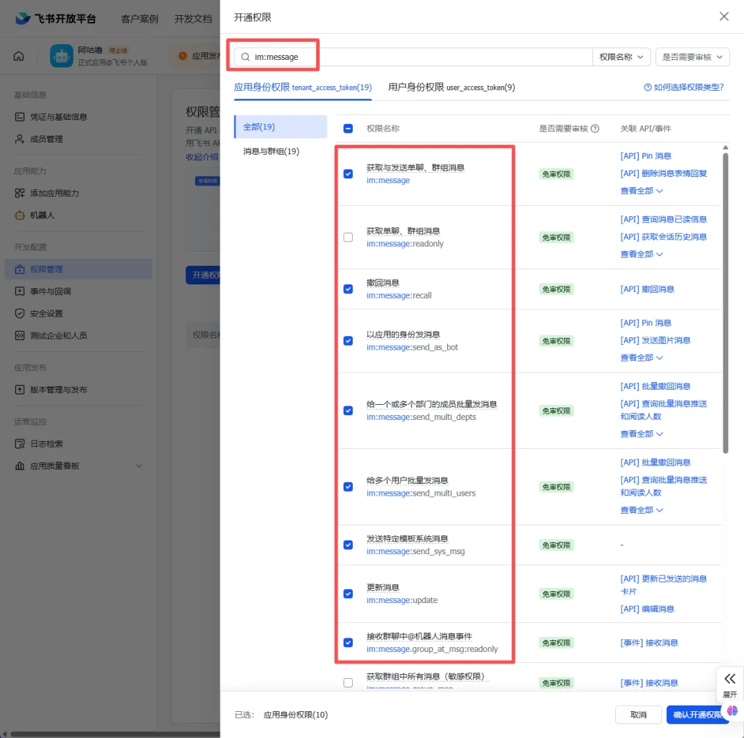 在搜索框中输入 im:message,找到消息相关权限后点击开通。