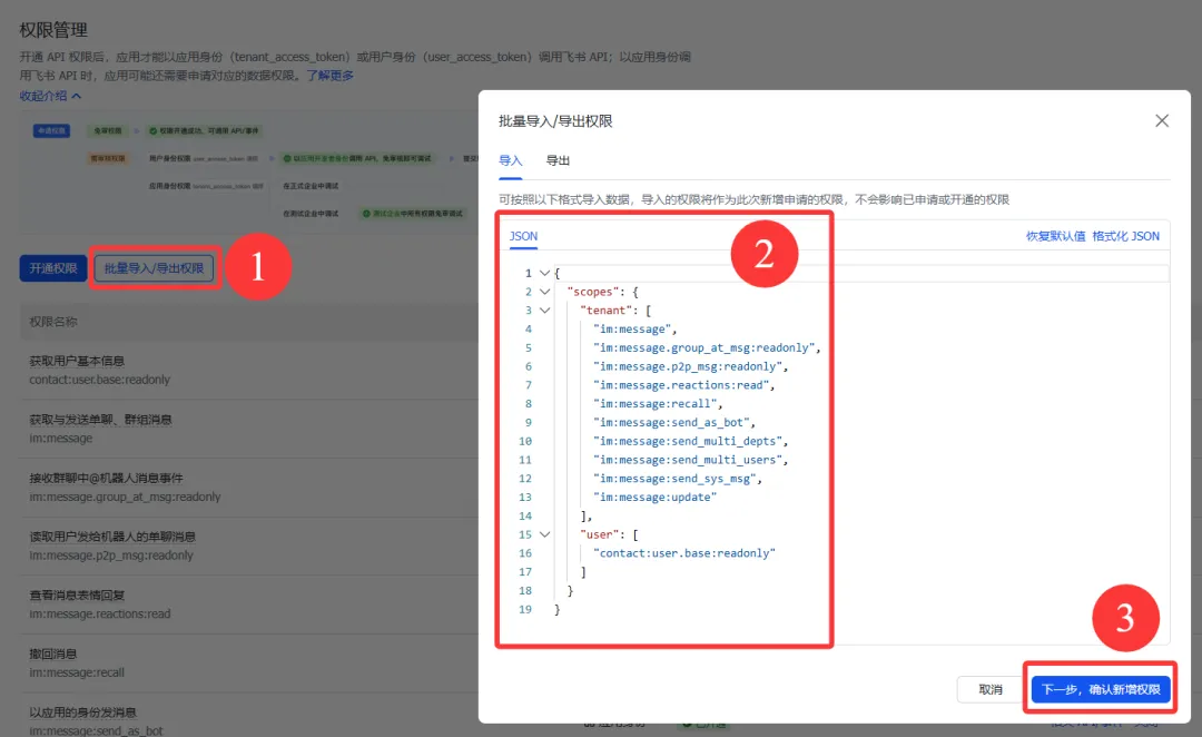 更快的方式:如果觉得逐个开通权限太麻烦,可以使用「批量导入/导出权限」功能。点击批量导入,将下方 JSON 复制粘贴到导入框中: