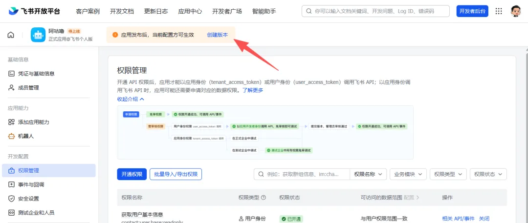 权限配置完成后,点击「创建版本」。