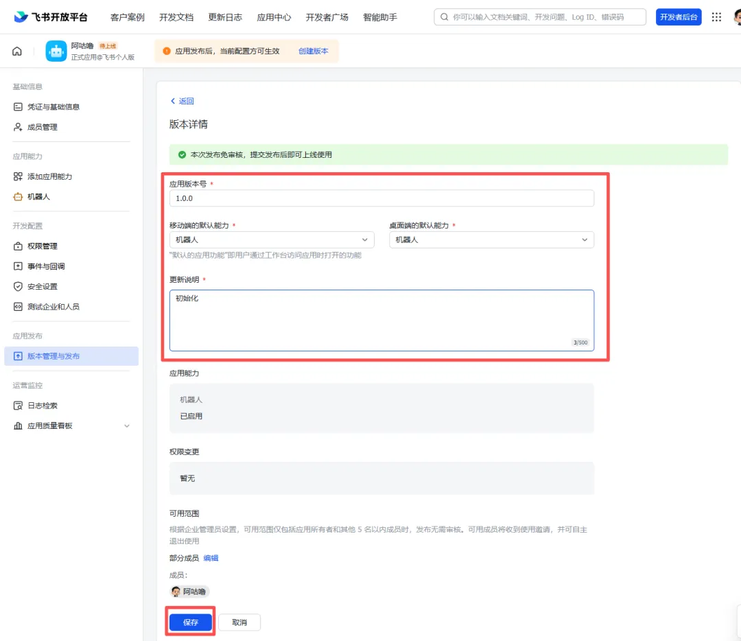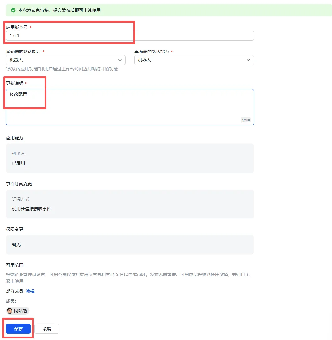 { "scopes": { "tenant": [ "contact:contact.base:readonly", "im:message", "im:message.group_at_msg:readonly", "im:message.p2p_msg:readonly", "im:message.reactions:read", "im:message:recall", "im:message:send_as_bot", "im:message:send_multi_depts", "im:message:send_multi_users", "im:message:send_sys_msg", "im:message:update" ], "user": [ "contact:user.base:readonly" ] }}步骤 4:创建版本并发布