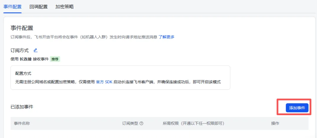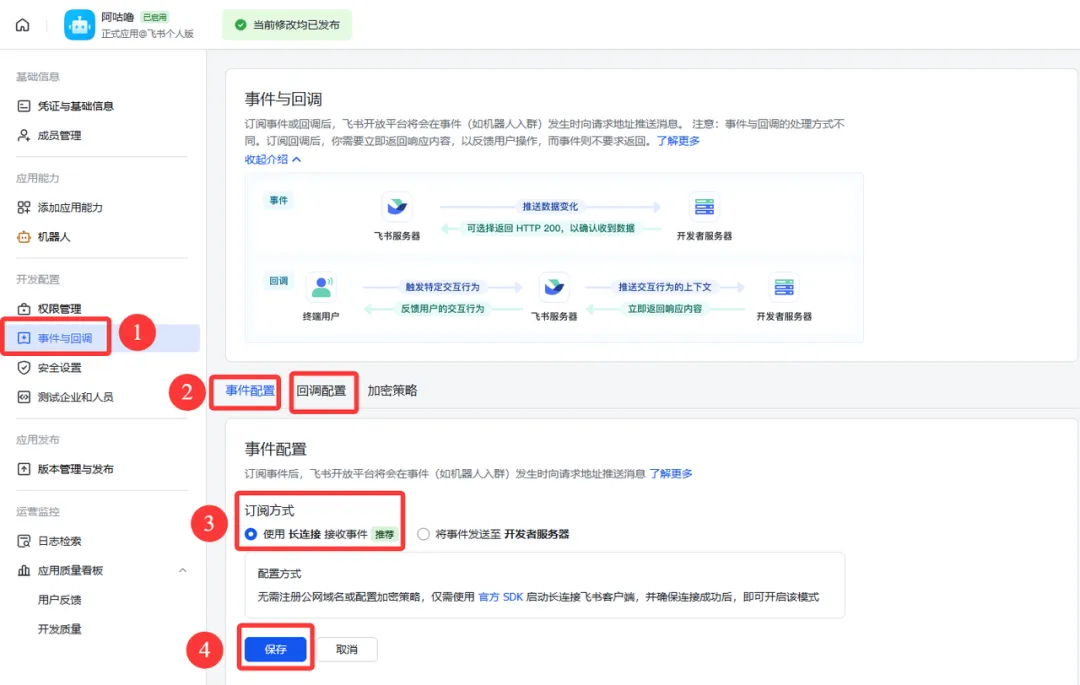 在「事件配置」和「回调配置」两个 tab 中,订阅方式都选择「使用长连接接收事件」,然后点击「保存」。